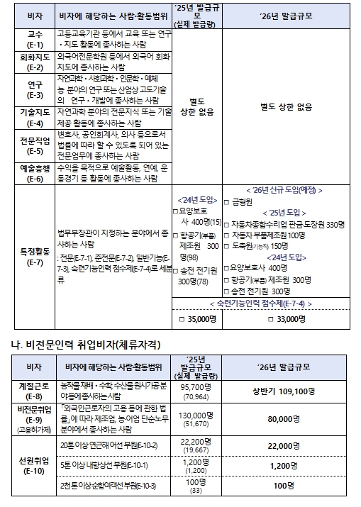 그 밖에 요양보호사, 송전전기원 등 이미 시범운영 중인 직종과 계절근로·비전문취업 비자 등은 외국인력 수요와 체류 실태를 종합적으로 고려하여 필요한 범위 내에서 연간 발급규모를 관리할 계획이다