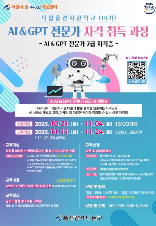 [코리아 이슈저널=김태훈 기자] 울산 남구 ‘여성내:일(My-Job)이음센터’는 급변하는 4차 산업혁명과 디지털 전환 가속화에 따라 여성의 전문 직무 역량 강화를 위한 프로그램으로 ‘AI · GPT 전문가 자격 2급 취득 과정’을 오는 11월 11일부터 24일까지 운영한다고 밝혔다.