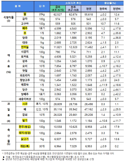 ▲ 주요 농축산물(28개 품목) 소비자가격 동향(4.16일 기준)