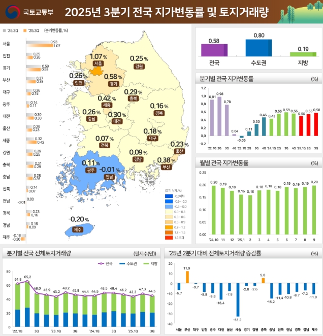 '25년 3분기 전국 지가는 0.58% 상승했다. 상승폭은 '25년 2분기(0.55%) 대비 0.03%p 확대, '24년 3분기(0.59%) 대비 0.01%p 축소된 것으로 나타났다.
