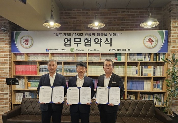 [코리아 이슈저널=최준석 기자] 2025년 9월 4일, ㈜한국에너지서비스(대표 김영직)는 컨설팅 기업 Plumline(대표 신이철), ㈜지필로스(대표 박가우)와 함께 가칭 ‘Net Zero Oasis’ 통합 신재생에너지 플랫폼의 공동 개발과 보급을 위해 9월 3일 3자 업무협약(MOU)을 체결했다.
