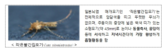 일본뇌염 매개모기인 작은빨간집모기는 암갈색 소형 모기로 주로 야간에 흡혈활동을 하고, 우리나라 전 지역에서 10월까지 활동하는 것으로 관찰된다. 일본뇌염 매개모기 감시 결과 9월말 기준(39주차) 평균 108개체로 지속적으로 발생하고 있으므로, 모기 물림에 주의하고, 증상 발현 시 신속하게 의료기관을 방문하여 진단 및 치료를 받아야 한다.
