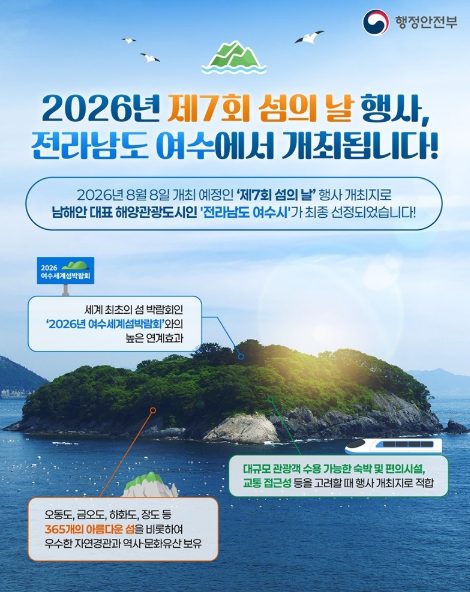 [코리아 이슈저널=김윤영 기자] 2026년 8월 8일 개최 예정인 '제7회 섬의 날' 행사 개최지로 남해안 대표 해양관광도시인 '전라남도 여수시'가 최종 선정되었습니다!