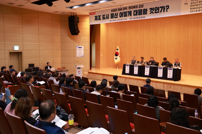 [코리아 이슈저널=김태훈 기자] 울산 동구는 10월 24일 오후 2시 동구청 5층 중강당에서 ‘트럼프 정부 관세 압박과 현지 투자 강요, 제조 도시 어떻게 대응할 것인가?’란 주제로 기획토론회를 개최했다.