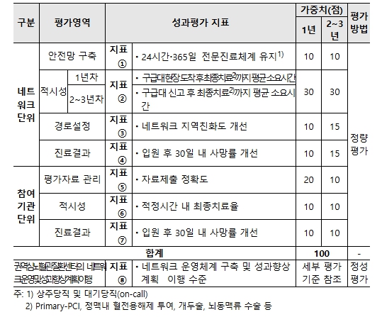 | ▲ 권역심뇌혈관질환센터 기반 기관 간 네트워크 시범사업 평가기준 |