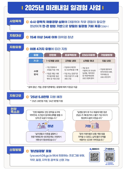 고용노동부는 미래내일 일경험 사업을 통해 5.8만명의 청년들에게 일경험 기회를 제공하고 있는데, 참여한 청년들은 직무역량 향상 및 직무탐색, 해당 기업에 대한 인식 개선 등에 도움이 된다는 측면에서 긍정적 반응을 보이고 있으며(만족도 91점), 이를 바탕으로 해당 기업 또는 유사 업종에 취업*하고 있다. 참여 기업의 경우에도 청년층 대상으로 기업의 인지도를 높이고, 우수 인재 탐색채용 기회로 활용할 수 있어 높은 재참여 의사(98%)를 보이고 있다.