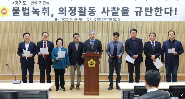 [코리아 이슈저널=홍춘표 기자] 경기도의회 도시환경위원회(김시용 위원장, 국민의힘, 김포3)는 18일 경기도의회 기자회견장에서 진행된 기자회견을 통해 경기도 기후환경에너지국 소속 공직자가 산하기관인 코리아경기도주식회사 직원에게 의원 간담회 내용을 불법 녹음하도록 지시한 사실을 강력히 규탄했다.