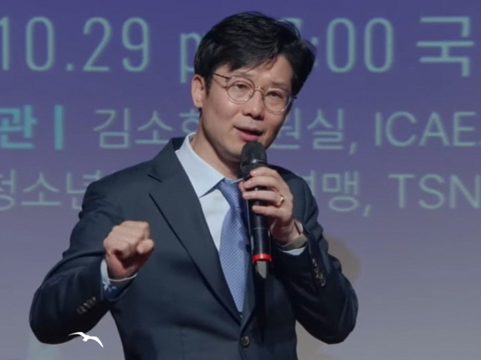 ▲ 주광 김용두(SNS기자연합회 회장) ICAE 국제컨퍼런스에서 강연하는 모습 / SNSJTV 제공