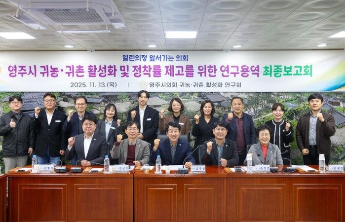 [코리아 이슈저널=김태훈 기자] 영주시의회 의원연구단체인 '귀농·귀촌 활성화 연구회'는 13일 영주시의회 소회의실에서 '귀농·귀촌 활성화 및 정착률 제고 방안 연구용역' 최종보고회를 열고, 영주시 귀농·귀촌 정책의 현황과 향후 발전 방향을 논의했다.