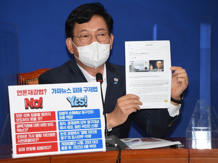 송 대표 측 관계자는 "언론중재법은 가짜뉴스로 인한 피해자를 구제하기 위한 민생 법률"이라며 "여기 앞장선다고 해서 중도 확장 기조가 퇴색되는 것이라는 지적에는 동의할 수 없다"고 말했다.
