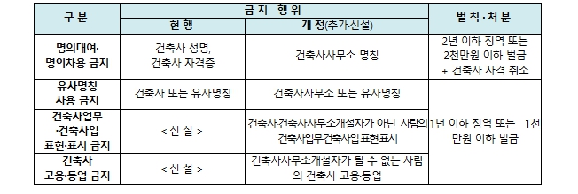 이에 따라, 건축사사무소 명의대여 등에 대한 금지 규정을 마련하고 위반 시 처벌할 수 있는 근거를 신설했다.