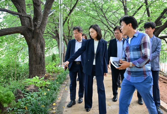[코리아 이슈저널=최성일 기자] 최호정 서울특별시의회 의장은 26일 안양천 생태연못 일대를 방문해 수목 등 식재된 조경 상태를 살피고 관계자들과 조경 유지관리 개선방안을 모색했다.