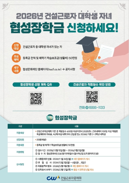 | ▲ [포스터] 2026년 건설근로자 대학생 자녀 협성장학금 |