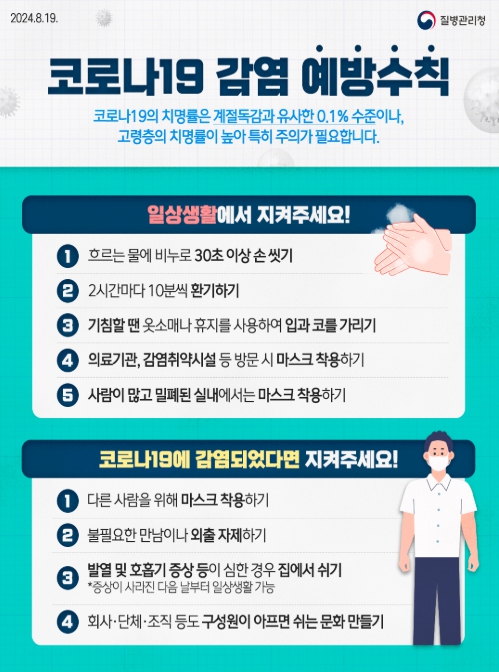 아울러, “추석 연휴를 건강하게 보내기 위해서는 우리 모두가 일상에서 손씻기, 주기적인 실내 환기, 기침 예절 준수 등 코로나19 감염 예방수칙을 실천하는 것이 무엇보다 중요하다.”고 전하고,“질병관리청은 코로나19 발생 상황을 지속해서 살피고, 필요한 정보를 적시에 공유할 것이며, 추석 연휴 기간에도 필요한 대응을 이어갈 것”이라고 밝혔다.