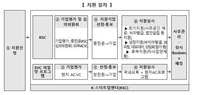SVC는 ▲해외 창업생태계 등 현지 동향 조사, ▲기술실증, ▲국내 창업지원 사업의 현지 연계, ▲투자유치, ▲해외 진출 보증 등을 지원하는 창업기업 지원 전문 허브이다. KSC 입주기업은 유관기관을 통해 관련 서비스를 원스톱으로 지원받을 수 있다. 중기부는 SVC에 유관기관을 집적하여 해외거점 운영을 효율화하고 보육·기술실증·보증·투자유치 등 지원을 강화할 계획이다.