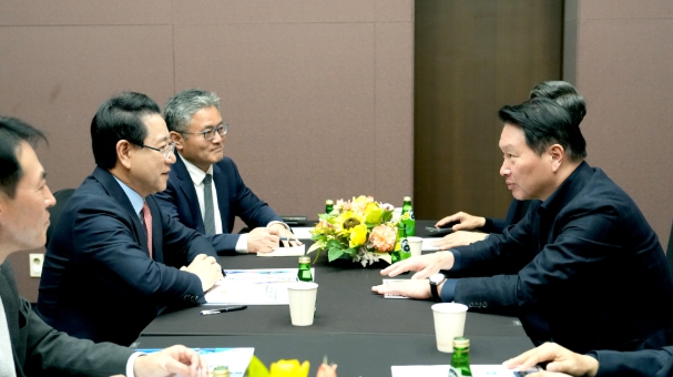 ▲ 김영록 전라남도지사가 3일 서울 코엑스 오픈미팅룸에서 최태원 SK그룹 회장과 면담을 갖고 ‘오픈AI AI데이터센터’ 등과 관련해 투자협의를 하고 있다.