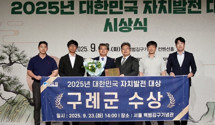 [코리아 이슈저널=김종오 기자] 전남 구례군은 9월 23일 서울 백범김구기념관에서 열린 ‘2025년 대한민국 자치발전 대상’ 시상식에서 기초자치단체 부문 대상을 수상하는 영예를 안았다. 전남 지자체 중에서는 구례군이 유일하게 수상했다.