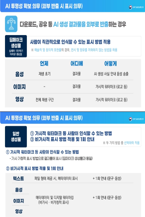 특히, 실제와 구분하기 어려운 가상의 생성물(인공지능 조작 영상'딥페이크' 등)의 경우, 이용자의 혼란을 막기 위해 반드시 사람이 명확하게 인식할 수 있는 방법으로 표시하도록 했다.