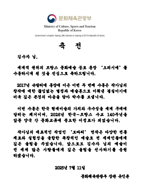 [코리아 이슈저널=김윤영 기자] 문화체육관광부 유인촌 장관은 7월 11일, 프랑스 문화예술 공로 훈장 ‘오피시에’를 수훈한 한국 현대미술 김수자 작가에게 축전을 보내 축하와 감사의 뜻을 전했다.