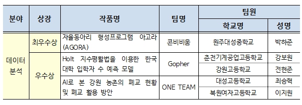 | ▲ 제7회 교육 공공데이터 분석·활용대회 수상내역(강원) |