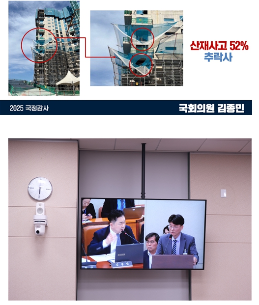 김 의원은 “산재 사고의 51%, 절반이 추락사다. 낙하방지망을 다 설치했는데 그게 뚫린다. 낙하방지망만 튼튼하면 떨어져도 다칠 수는 있어도 죽지는 않게 해야 그게 안전망이다. 근데 그 망이 뚫린다”라며 문제의 심각성을 지적했다.