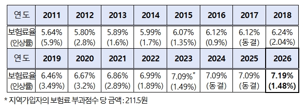 ’26년 직장·지역가입자 보험료율 7.19%로 올해대비 0.1%p(전년대비 1.48%) 인상
