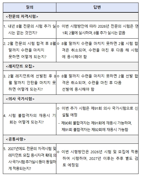 그동안 2025년 하반기 전공의 모집을 통해 상당수 전공의가 수련병원에 복귀했고, 9월부터 수련을 재개한 레지던트 마지막 연차는 내년 8월 말에 수련을 마칠 예정이다. 기존의 자격시험 일정에 따를 경우, 내년 수련완료 예정인원 2천여 명 중 약 2/3에 해당하는 1,300여 명이 내년 8월에 수련을 마치고 2027년 2월 자격시험까지 6개월간 대기해야 하며, 이에 따라 전문의 인력 배출도 지연되는 문제가 제기되어 왔다.