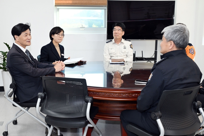 | ▲ 안병구 밀양시장이 11일 밀양소방서를 방문해 소방대원들을 격려하고 지역 안전 강화 방안을 논의하고 있다. |