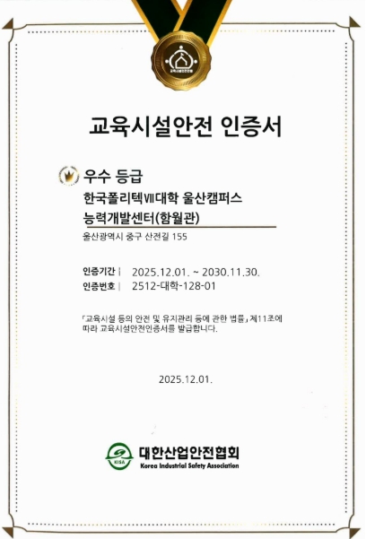 한국폴리텍대학은 실습 중심의 기술 교육 대학으로 이번 안전 인증 성과를 바탕으로 예비 기술 인재들이 마음 놓고 기술을 연마할 수 있는 쾌적한 교육 환경을 유지·발전시킬 계획이다.