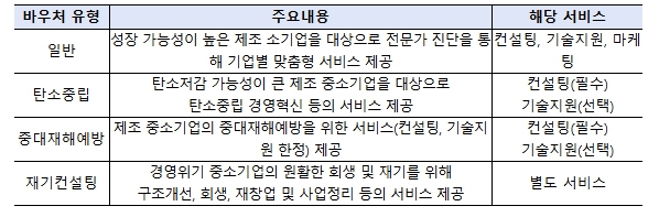 기업의 특성과 필요에 따라 4가지 유형(①일반, ②탄소중립, ③중대재해예방,④재기컨설팅)으로 구분하며, 유형별로 기업 특성에 맞춘 3개 서비스(컨설팅·기술지원·마케팅)를 바우처 방식으로 지원할 예정이다.