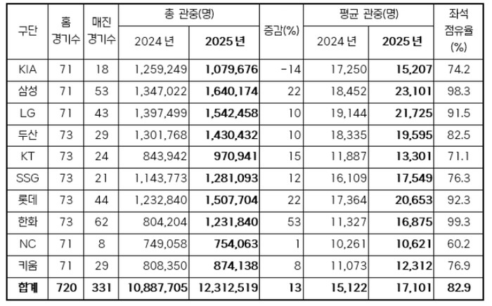 최종적으로 2025시즌은 지난 시즌 보다 약 13% 증가한 1,231만 2,519명의 관중이 입장하며 평균 관중 1만 7,101명을 기록했다. 전체 경기 수의 약 46%인 331경기가 매진됐고, 좌석 점유율 또한 82.9%를 기록했다.