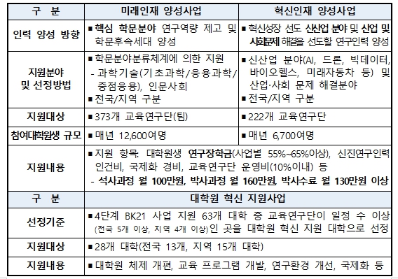 4단계 두뇌한국(BK)21 사업(2020년~2027년)은 세계 수준의 연구중심대학 육성과 대학원 혁신을 목표로 운영되고 있으며, 매년 약 2만 명의 대학원생과 신진 연구자를 지원하고 있다.