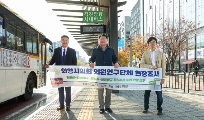 [코리아 이슈저널=홍춘표 기자] 의왕시의회 의원연구단체‘의왕시에서 광명역과 분당·판교로 가는 광역버스 노선 신설 추진 방안을 연구하는 의원 모임’ 소속 한채훈 대표의원과 서창수, 박현호 의원 등은 11일, 신규 광역버스 노선 도입의 당위성과 효율성을 확보하기 위해 성남시 일원에서 현장 조사를 진행했다.