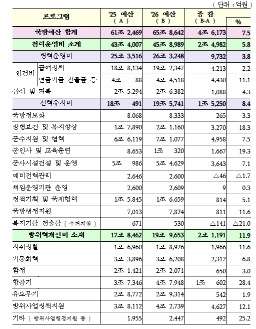 [코리아 이슈저널=최준석 기자] 2026년도 국방예산이 12월 2일 국회 본회의 의결을 거쳐 전년 대비 7.5% 증가한 65조 8,642억원으로 확정됐다.