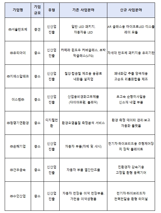 사업재편계획 승인기업의 사업재편계획은 다음과 같다. 디스플레이 부품사인 ㈜서울반도체는 마이크로LED 원천기술을 바탕으로 AR글래스용 디스플레이 모듈 시장에 진출하고, ㈜유티아이는 초박막 글래스 등을 제조하는 고정밀 유리제조기술을 활용하여 반도체 패키지용 유리기판 사업에 진출한다. ㈜지에스알테크는 철강 용광로 내화물(벽돌 등) 시공업에서 이차전지 양극재 생산 후 폐기되는 내화물에서 리튬을 추출·재활용해 양극재 원료를 공급한다. ㈜건우금속은 내연기관차 베어링·변속기 부품 제조기술에 인공지능 자율제조모델을 도입하는 제조공정 고도화를 통해 전기차용 환형 동력기어를 개발한다.
