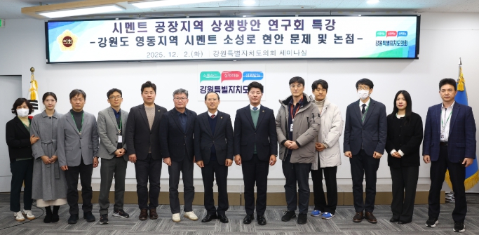 [코리아 이슈저널=홍춘표 기자] 강원특별자치도의회 의원연구단체인 '시멘트 공장지역 상생방안 연구회'는 12월 2일 오후 5시, 도의회 세미나실에서 ‘강원도 영동지역 시멘트 소성로 현안 문제 및 논점’을 주제로 특강을 개최했다.