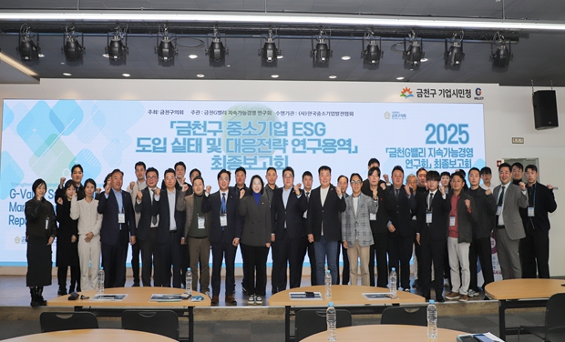 [코리아 이슈저널=홍춘표 기자] 서울특별시 금천구의회 의원연구단체인‘금천G밸리 지속가능경영 연구회’는 지난 12월 1일 금천G밸리 기업시민청에서 '금천구 중소기업 ESG 도입 실태 및 대응전략 연구용역' 최종보고회를 개최했다.