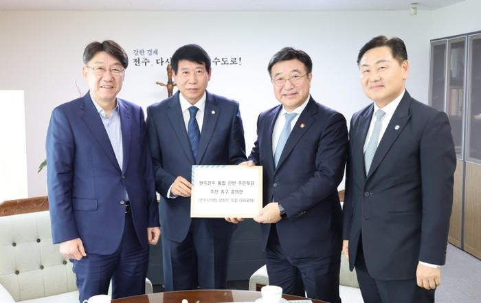 남 의장은 대한민국사회적경제박람회 참석을 위해 이날 전주를 방문한 윤 장관에게 결의안을 전달하며 “완주‧전주 통합은 행정 효율성 제고를 넘어, 전북의 성장 거점을 완성하기 위한 시대적 과제”라며 “정부가 양 지역의 통합을 위해 주민투표를 할 수 있도록 적극적 지원과 협력에 나서달라”고 요청했다.