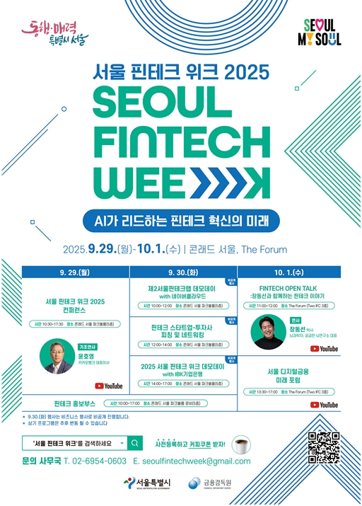 또한 서울시·카이스트·한국지급결제학회가 공동 주최하고, 한국인터넷기업협회가 주관하는 ‘서울 디지털금융 미래 포럼’에서는 공공·산업·학계 전문가들이 인공지능과 디지털금융의 발전 전략을 논의한다.