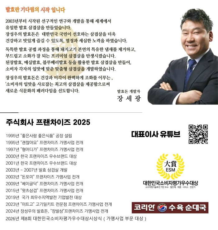 (주)프랜차이즈2025는 30여 년간 외식·식품 산업을 선도해 온 기업으로, 지속적인 연구개발을 통해 다양한 브랜드를 선보여 왔다. 특히 ‘장성우의 발효돈’은 독자적인 발효 공법으로 완성된 세계 최초의 발효 삼겹살로, 차별화된 기술력과 상품성을 인정받은 바 있다.