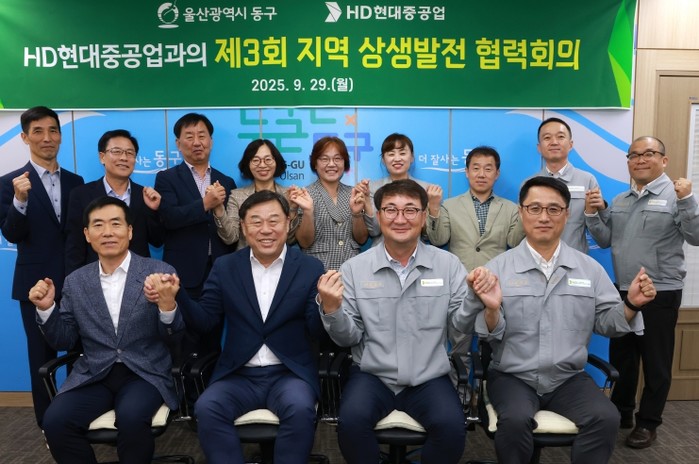 [코리아 이슈저널=김태훈 기자] 울산 동구청과 HD현대중공업은 9월 29일 오전 11시 동구청장실에서 ‘제3회 지역 상생발전 협력회의’를 개최했다. 이날 회의에는 김종훈 동구청장과 HD현대중공업 김상회 전무를 비롯한 양측 간부 공무원과 임직원이 참석했다.