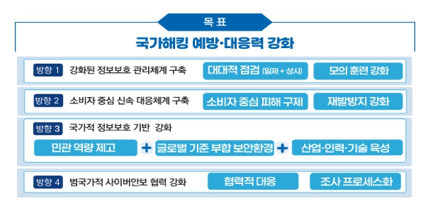 이를 위해 국가안보실을 중심으로 과기정통부, 금융위원회. 개인정보보호위원회, 국가정보원, 행정안전부 등 관계부처 합동으로 민간과 공공을 아우르는 범부처 정보보호 종합대책을 수립했다. 동 대책은 현 사안의 시급성을 고려하여 즉시 실행할 수 있는 단기과제 위주로 제시했으며, 이후 중장기 과제를 망라하는 '국가 사이버안보 전략'을 연내 수립할 계획이다.