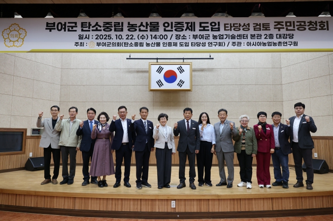 [코리아 이슈저널=홍춘표 기자] 부여군의회는 22일 부여군농업기술센터 대강당에서 ‘탄소중립 농산물 인증제 도입 타당성 검토’를 주제로 한 주민공청회를 개최했다.