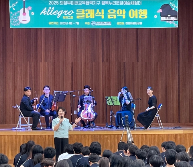 [코리아 이슈저널=홍춘표 기자] 의정부교육지원청은 지난 7월 한 달간 관내 8개 중·고등학교에서 운영된 '학교로 찾아가는 행복누리문화예술체험터' 클래식 앙상블 공연이 성황리에 마무리됐다고 밝혔다.