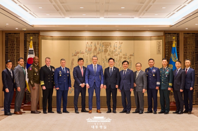 [코리아 이슈저널=최성일 기자] 이재명 대통령은 11월 4일 오후 대통령실에서 한미안보협의회의(SCM : Security Consultative Meeting) 참석을 위해 한국을 방문한 피트 헤그세스 미국 전쟁부장관의 예방을 받고 한미동맹이 미래형 포괄적 전략동맹으로 심화 발전해 나가는 데 있어 헤그세스 장관의 중요한 역할을 당부했다.