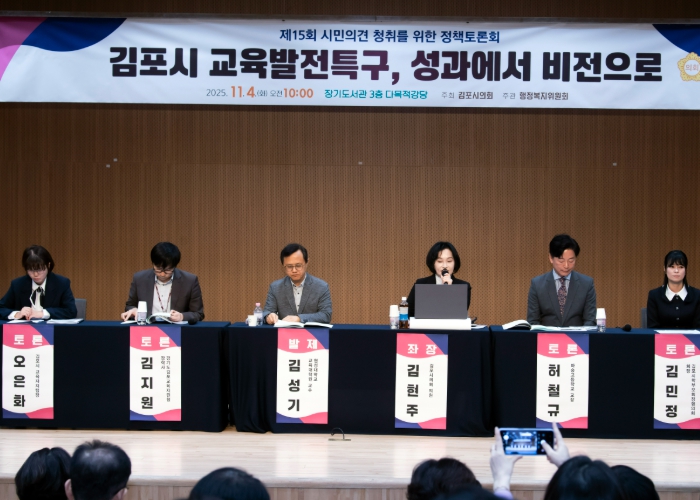 [코리아 이슈저널=홍춘표 기자] 김포시의회 행정복지위원회는 11월 4일 장기도서관에서 ‘김포시 교육발전특구, 성과에서 비전으로’를 주제로 제15회 정책토론회를 열었다.