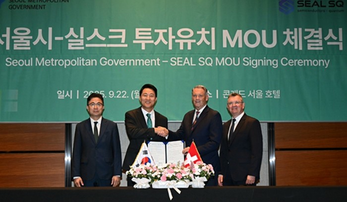 | ▲ 9월 22일 오전 열린 '서울시-실스크사 투자유치 MOU'에서 오세훈 서울시장을 비롯한 참석자들이 협약 체결 후 기념촬영을 하고 있다.(왼쪽부터 주용태 경제실장, 오세훈 서울시장, 데이빗 퍼거슨 WISeKey 부회장 겸 실스크 이사, 로익 아몽 ‘실스크(SEALSQ)’ 최고운영자) |
