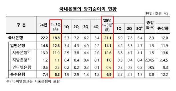 금융감독원이 20일 발표한 '2025년 1~3분기 국내은행 영업실적'에 따르면 당기순이익은 21.1조원으로 전년 동기(18.8)조원 보다 2.3조원(12%) 증가했다.