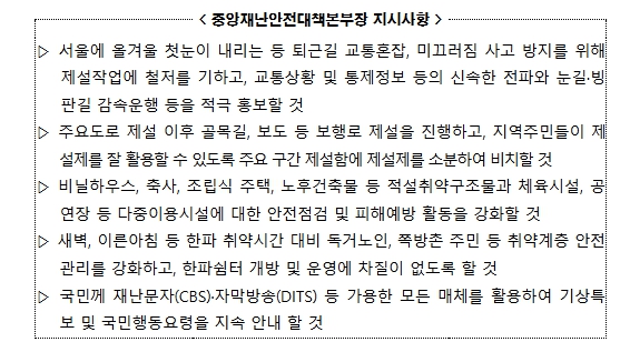 아울러, 국민께서도 기상정보를 수시로 확인하고, 주간 시간대 안전한 상황에서 제설작업을 실시하는 등 국민행동요령을 준수해 주실 것을 당부했다.