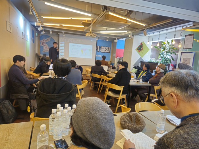 | ▲ 7일 AOK 회원들이 로창현 기자의 'AI, 다시 남북의 봄을 말하다' 의 신간 설명을 듣고 있다. |